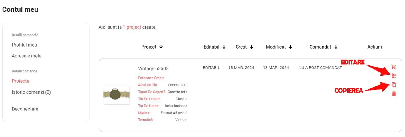 Dacă doriți să recomandați o comandă care a fost deja plasată, utilizați pictograma de copiere din dreapta pentru a face o copie a proiectului și comanda poate fi plasată din nou.